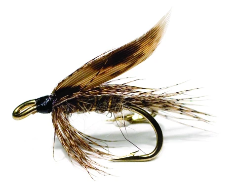 marts Brungrå. Klassiske ørredfluer bundet på en brun, dunøjet dobbelt Mustad-krog.