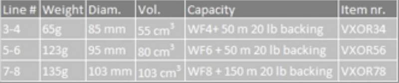 Et premium-hjul kræver en bremse i verdensklasse, masser af linekapacitet, en let, men stadig solid konstruktion og sidst, men absolut ikke mindst et unikt design for klart at adskille den fra alle de andre hjul på markedet. Det var vores hovedmål med XO-fluehjul.• Stor lysthus• Justerbar klikbremse på 3-4• Forseglet skivebremse på 5-6 & 7-8• Indbygget modvægt• SKF-lejefedtLine Diameter Volume Vægt Kapacitet#3-4 85 mm 55cm3 65g WF4 + 50 lb bagside