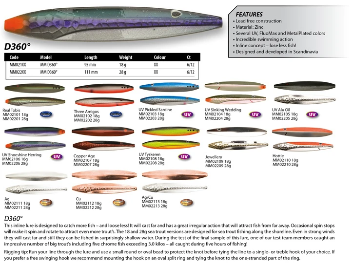 Smallere end den originale D360° og med mere vægt i halen giver det dig mulighed for at kaste til horisonten – selv i en stiv vind – på jagt efter den bedste fisk. Den roterer i apporten, så den store havørred bliver vild, og den kommer i en lang række uimodståelige håndmalede farver. Bare smid den ud og se den gå som en fiskesøgende raket!BlyfriMateriale: ZinkLangstøbt designHoldbare håndmalede detaljerede farverInline koncept – tab mindre fisk!Designet og udviklet i SkandinavienTip til rigging: Kør din line gennem lokken og brug en lille rund eller oval perle til at beskytte knuden, før du binder linen til en enkelt- eller diskantkrog efter eget valg. Hvis du foretrækker en fritsvingende krog, anbefaler vi at montere krogen på en oval splitring og binde knuden til den dobbeltstrengede del af ringen.